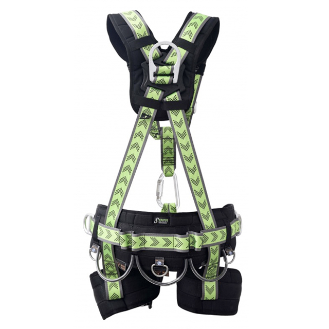Auffang-, Rückhalte- und Arbeitssitzgurt mit komfortablerm Haltegurt für Arbeiten in hängender Position. 1 Auffangöse hinten im Schulterbereich für Auffangsysteme, 1 Verankerungspunkt vorne auf Hüfthöhe und 2 seitliche Halteösen für die Arbeitsplatzpositionierung. Alle Schnallen mit Schnellverschluss. Äusserst komfortabler Rücken- und Oberschenkelschutz. Grösse S-L