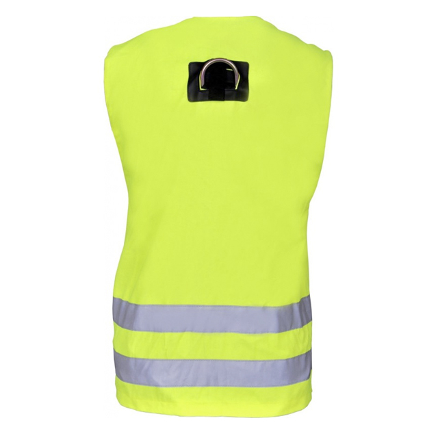 Multiffunktionsweste nach EN 471, neon-gelb mit Reflexstreifen. Mit mehreren Taschen. In der Weste befindet sich ein Auffanggurt mit Auffangösen für Auffangsysteme. Mit leicht einstellbaren Automatik-Schnellverschlüssen.