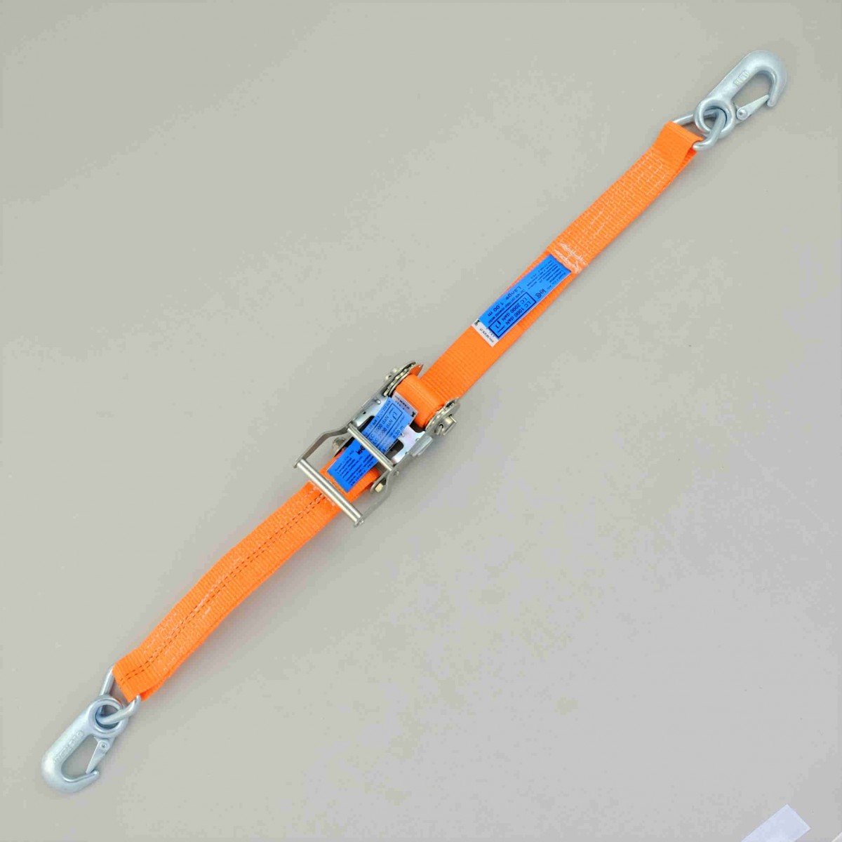 Ratsche aus hochfestem Stahl, verzinkt. Gurtband aus 100% Polyester, thermofixiert und dehnungsarm
