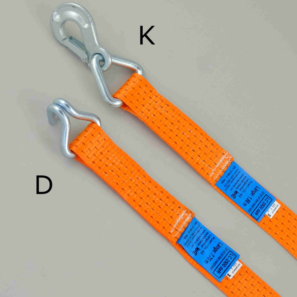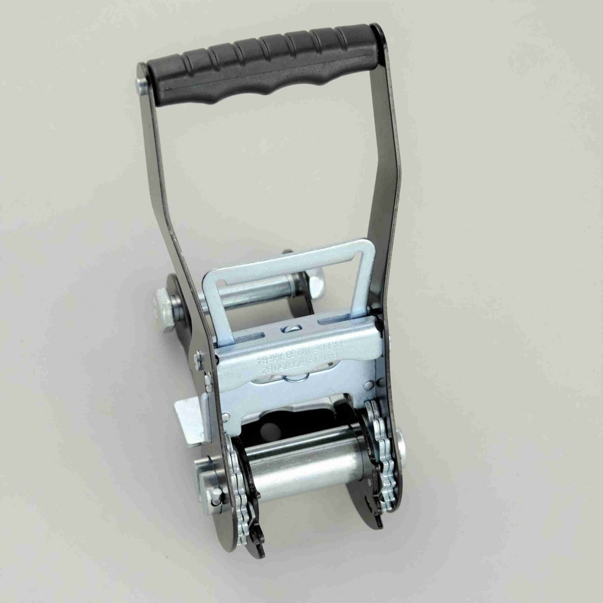 Ratsche aus hochfestem Stahl, verzinkt und schwarz kunstharzbeschichtet, mit Doppelverzahnung. Gurtband aus 100% Polyester, thermofixiert und dehnungsarm, mit beidseitiger Sicherheitsvernähung.