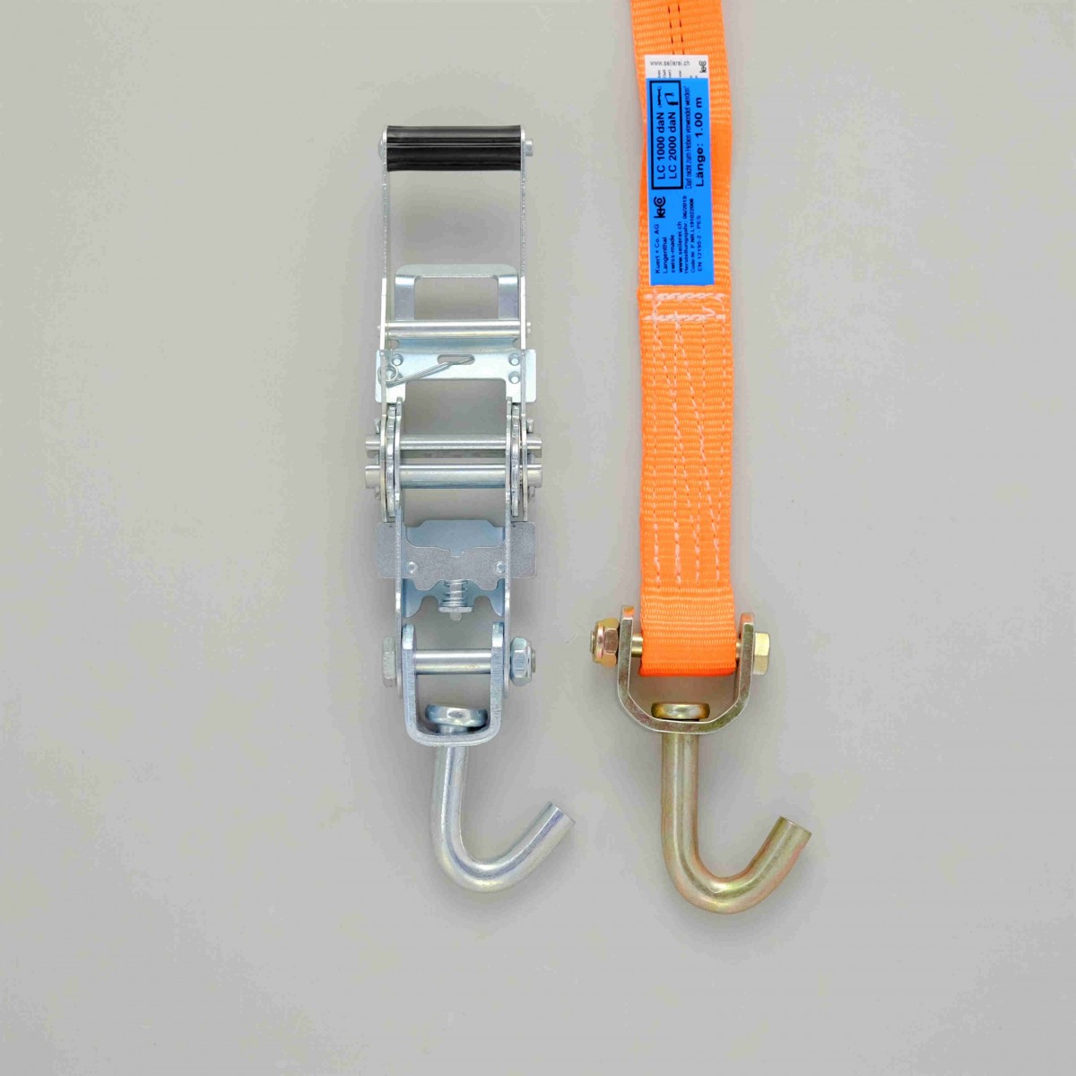 Ratsche aus hochfestem Stahl, verzinkt. Gurtband aus 100% Polyester, thermofixiert und dehnungsarm